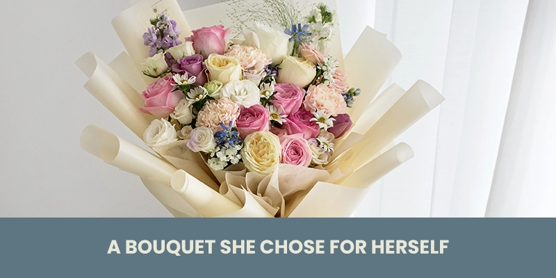 Ain smiled weakly. “Yeah… it’s been a long week. I thought maybe I should get something nice for myself.” Mei raised an eyebrow gently. “Good. You deserve that. Come, let’s find something that feels like you.” They walked slowly past bouquets wrapped in ivory, blush, and sandy beige tones. Roses, carnations, eustomas, and little pops of blue danced together in soft harmony. Ain’s eyes paused on a bouquet of a blend of pink, lavender, cream, yellow, and tiny blue flowers tucked between the petals. It felt cheerful, hopeful, and comforting all at once.