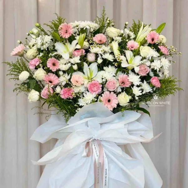 - Graceful Solace Stand blends of Pink Hydrangea, Pink Lilies, White Eustoma, Anastasia, Chrysanthemum, White Ping Pong and Cinerea.