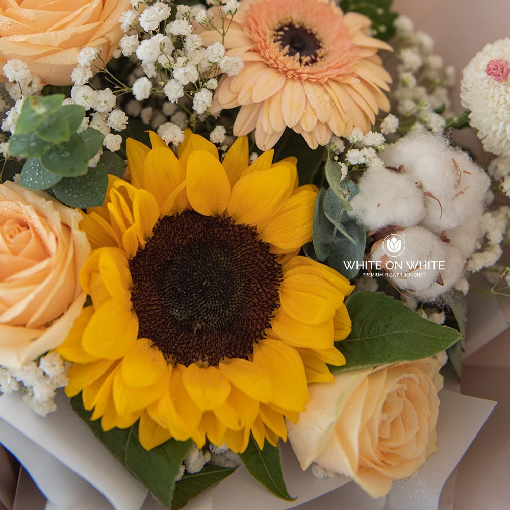 Sunflower, White Ping Pong, Champagne Roses, Gerbera Daisy, Baby Breath and Fillers