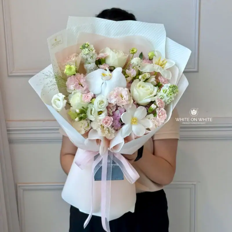 The color story of this bouquet is soft, romantic, and refreshing. You’ll find shades of white, soft pink, and blush gently woven together to evoke feelings of calm, love, and tenderness. Wrapped in complementary tones and tied with premium ribbon, the bouquet looks just as beautiful in presentation as it does in photos.