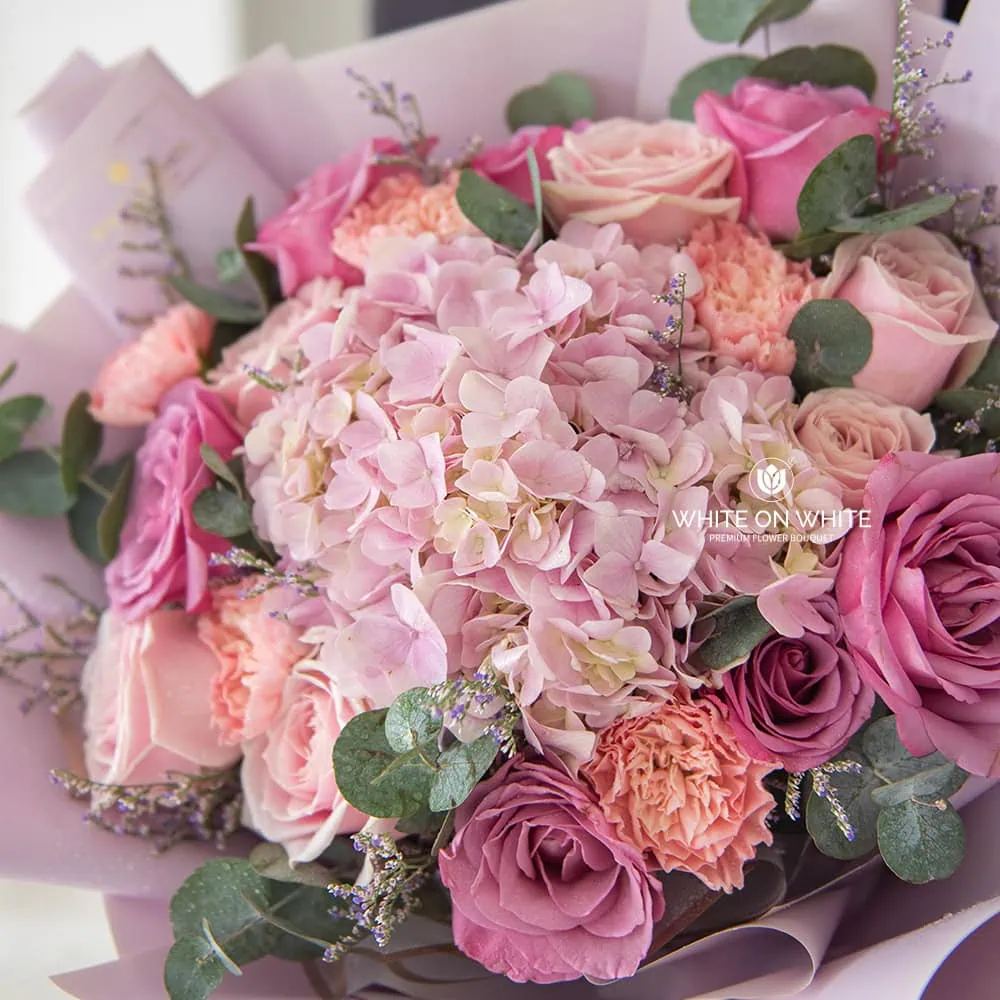 Pink Hydrangea, Purple Roses, Pink Roses, Pink Carnations, Caspia and Cinerea