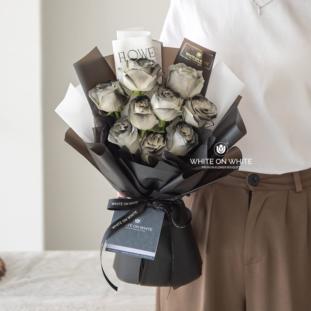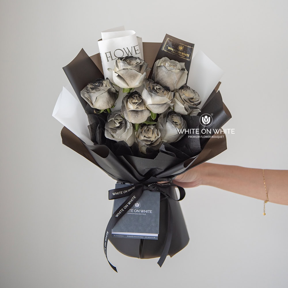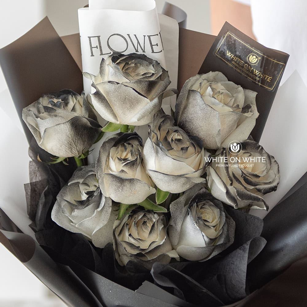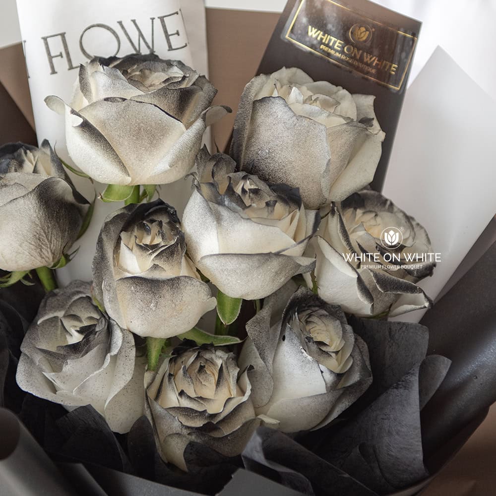 - This exquisite collection of 9 Blackish-Tinted White Roses is more than just flowers; it’s a declaration of profound emotion.