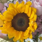 1 stalk of Sunflower, 1 stalk Purple Hydrangea, 1 stalk Yellow Rose, 3 stalks of Pink Rose, 2-3 stalks Pink Carnation Spray, 2 stalks of Matthiola, 1 stalk Purple Trachymene, 1 stalk Hana White, 2-3 stalks Chamomile, 1 stalk Cream Tinted Dry Violet, and Green Bell