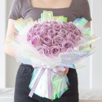 Wrapped in a festive, rainbow-colored plastic, the bouquet is bursting with personality—just like the woman you’re giving it to. The bright wrap complements the lush purple blooms, making it perfect for birthday celebrations that are full of laughter, light, and love.