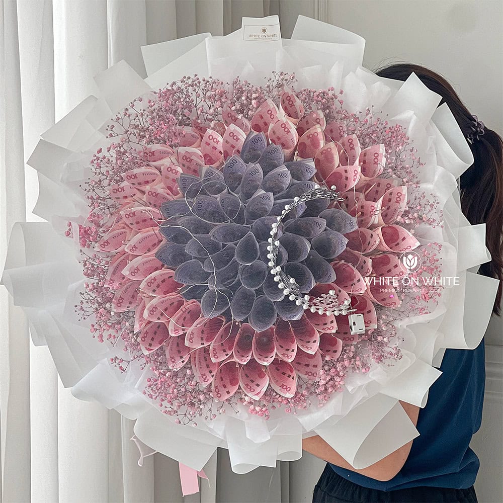 Why settle for ordinary when you can give a gift that truly stands out? The Crown Money Bouquet is for those who dare to be different, combining luxury and creativity, practicality, and a touch of boldness. This bouquet features 40 pieces of RM10 notes arranged with care, surrounded by delicate baby’s breath—a striking contrast of elegance and financial flair. It’s not just a bouquet; it’s a statement.