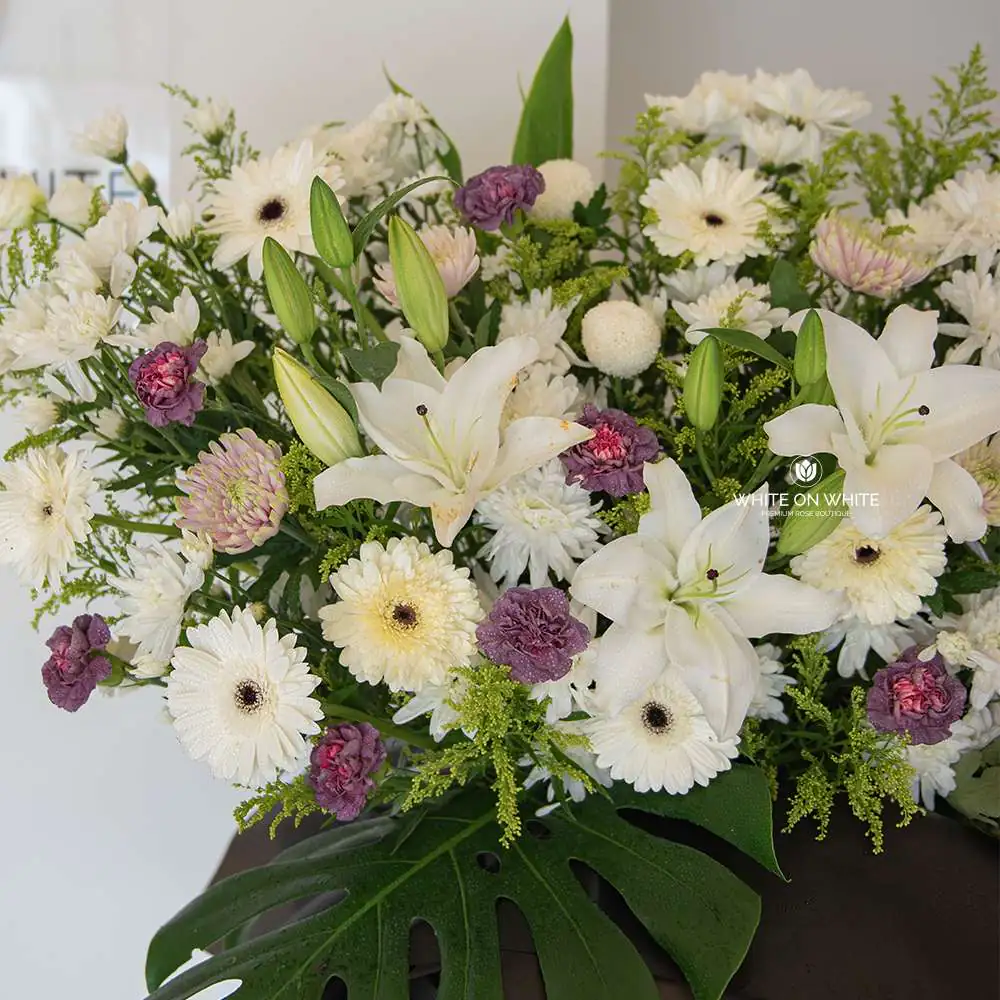 White Lilies, Gerbera Daisies, Chrysanthemum, White Ping Pong, Purple Carnations, Caspia, Cordyline and Monstera