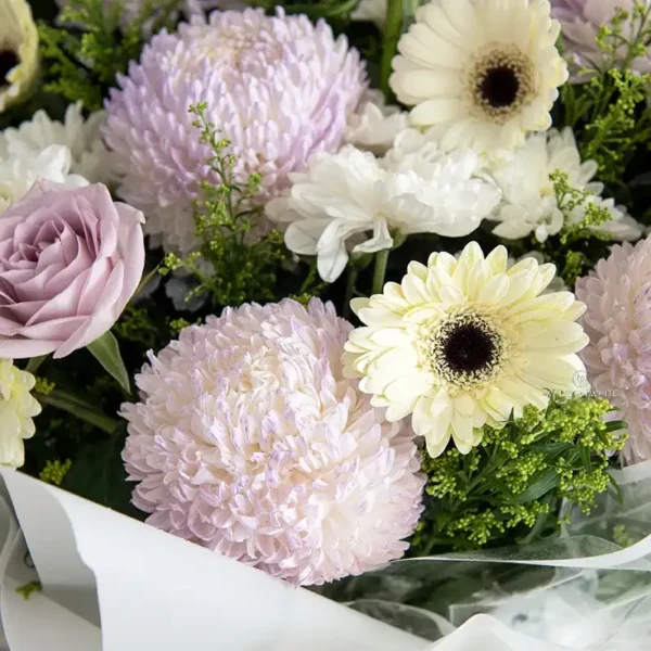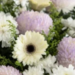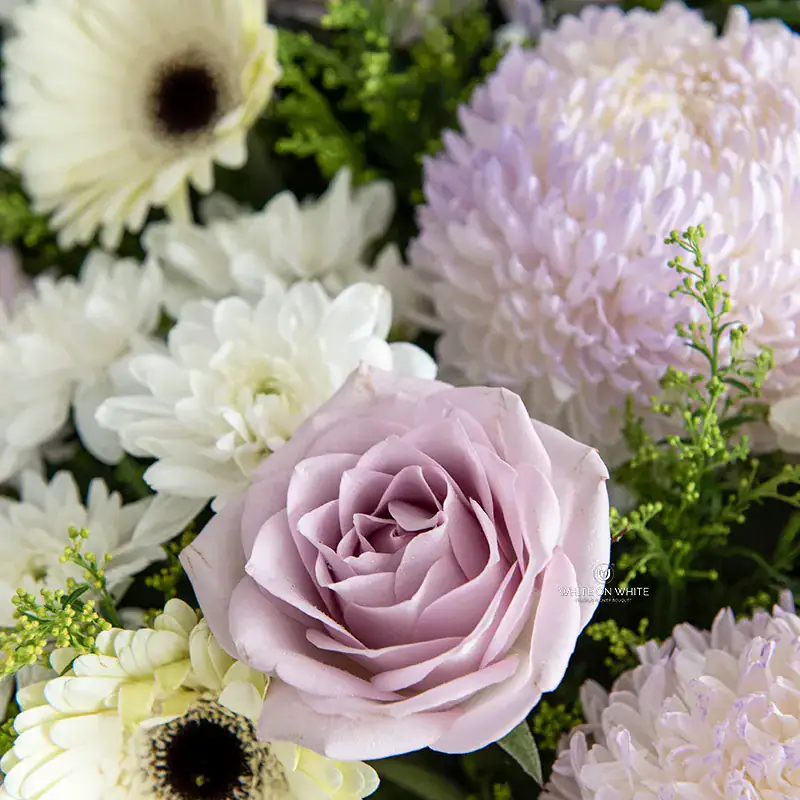Purple Tinted Chrysanthemum, White Gerbera, Ocean Song Rose, White Anastasia and Fillers