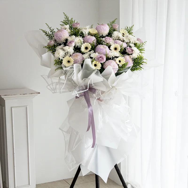 In moments of loss, words often fall short but flowers speak gently where silence feels heavy. The Deepest Sympathy Stand is created as a quiet companion to grief, a gesture of care that brings a sense of calm, comfort, and grace to those facing the weight of goodbye. Crafted with a thoughtful palette of Purple Tinted Chrysanthemums, White Gerberas, Ocean Song Roses, White Anastasias, and soft filler, this arrangement captures both sorrow and serenity in perfect balance.