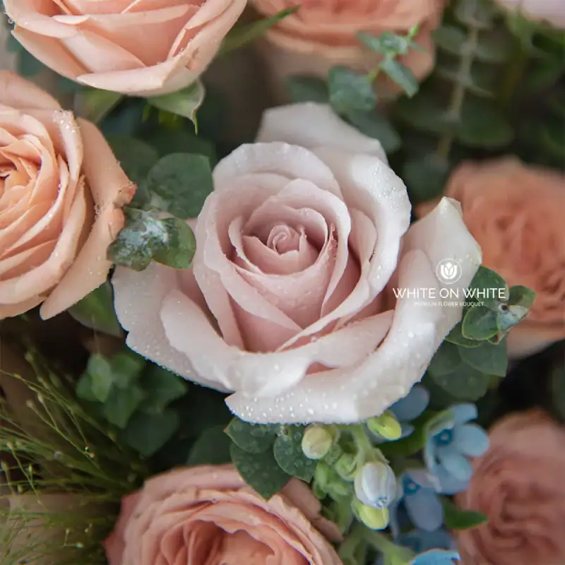 - At its core, seven imported Cappuccino Roses take center stage. Their creamy pink hue symbolizes pure love, admiration, and gratitude, mirroring the deep connection shared by lovers, just like you and your lovely partner.