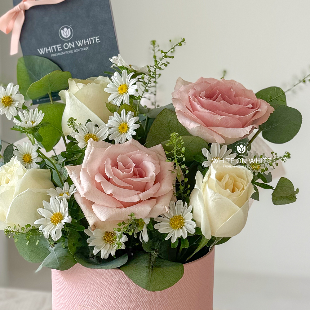- Cinerea & Greenbell: These foliage elements add depth and texture to the arrangement. While they may not carry specific symbolic meanings, they complement the roses and enhance the overall aesthetic appeal of the box.
