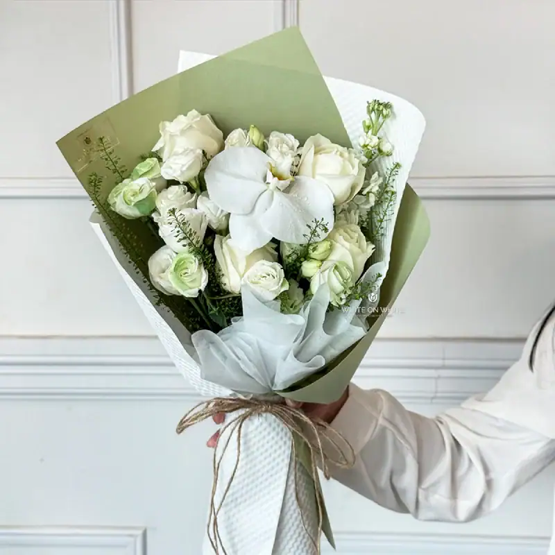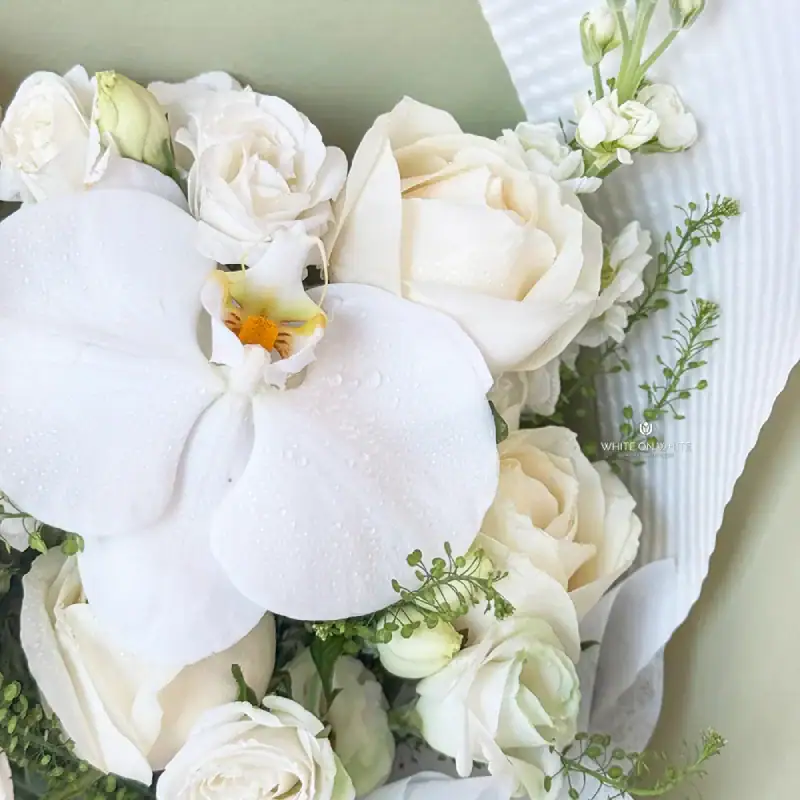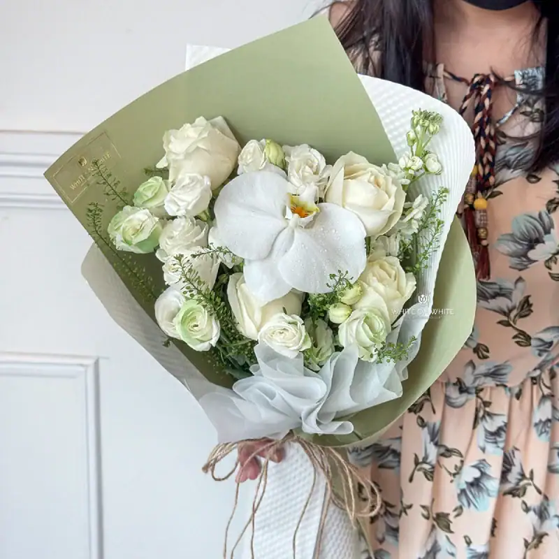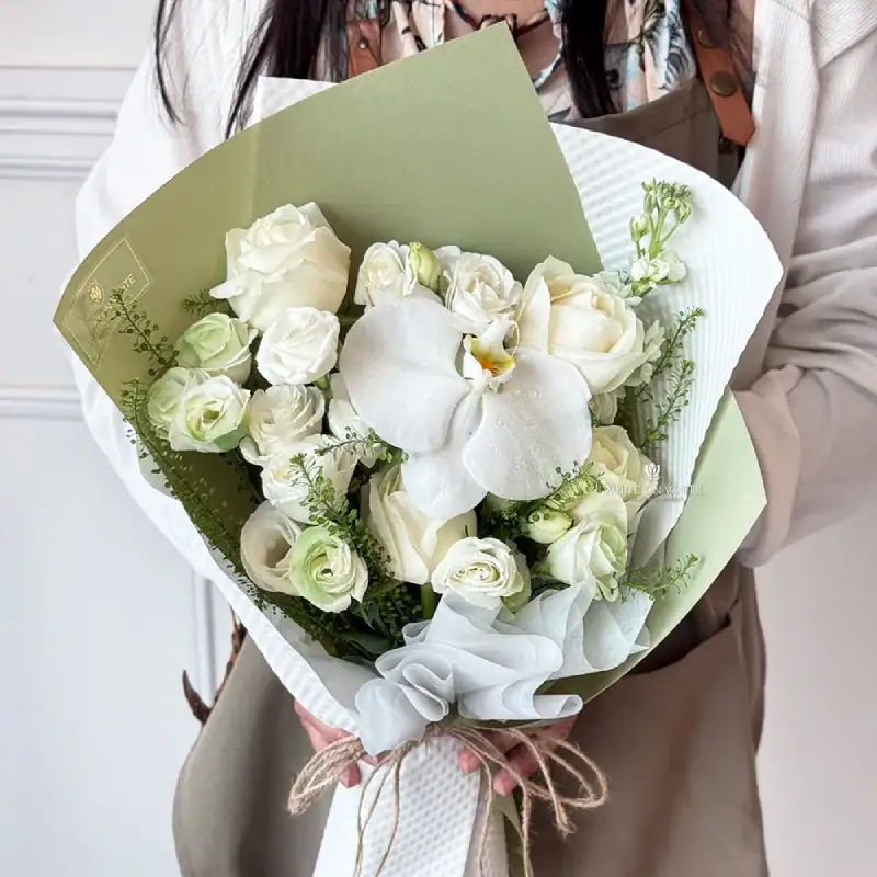 Thoughtfully arranged by our experienced florists, the First Love Bouquet brings together a poetic blend of fresh blooms: Phalaenopsis, White Roses, White Eustoma, White Mathiola, and Green Bell. Each flower tells its own love story together, they create an unforgettable expression of affection.