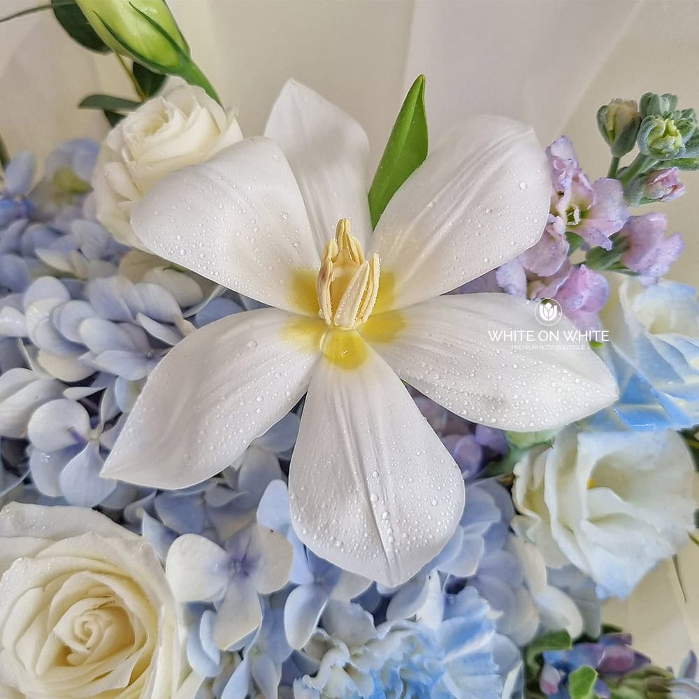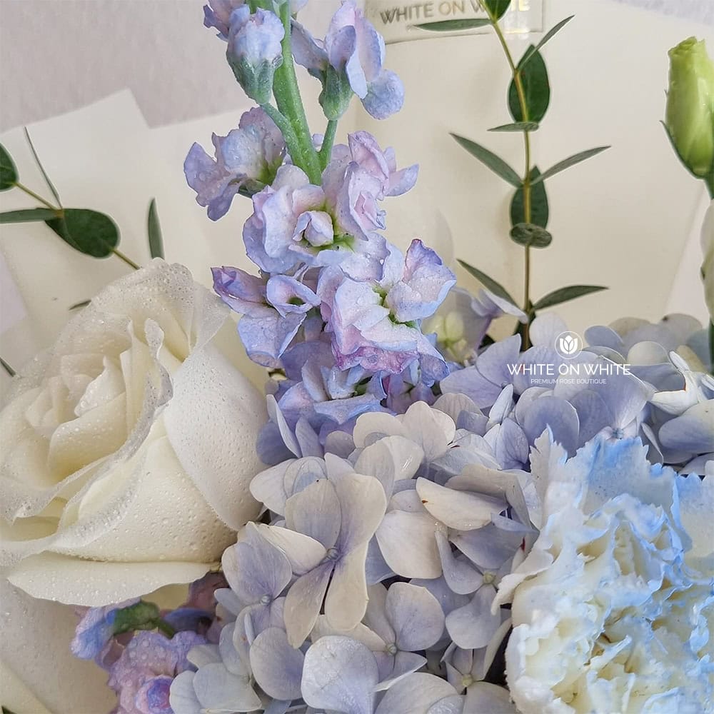 Blue Hydrangea, Blue Tinted Carnation, White Tulip, Mathiola, White Rose, White Eustoma, Oxypetalum, Eucalyptus Leaves