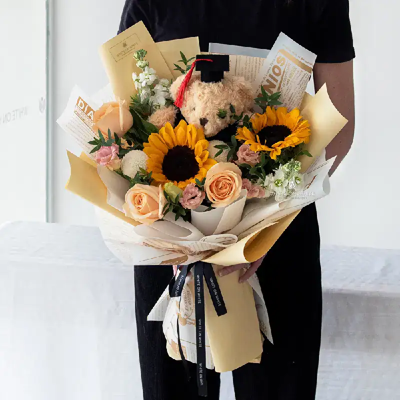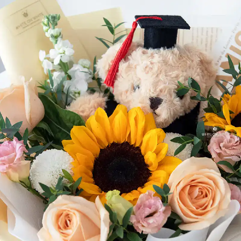 - On top of the bouquet, a cute graduation teddy bear proudly represents celebration, making this arrangement an unforgettable graduation flower.