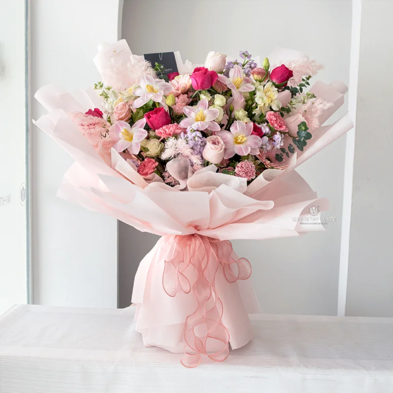 This bouquet requires a 3-day pre-order. As the flowers are imported, if we’re unable to get the specific flowers within 3 days, we may substitute them with similar flowers or switch to another design of the same value
