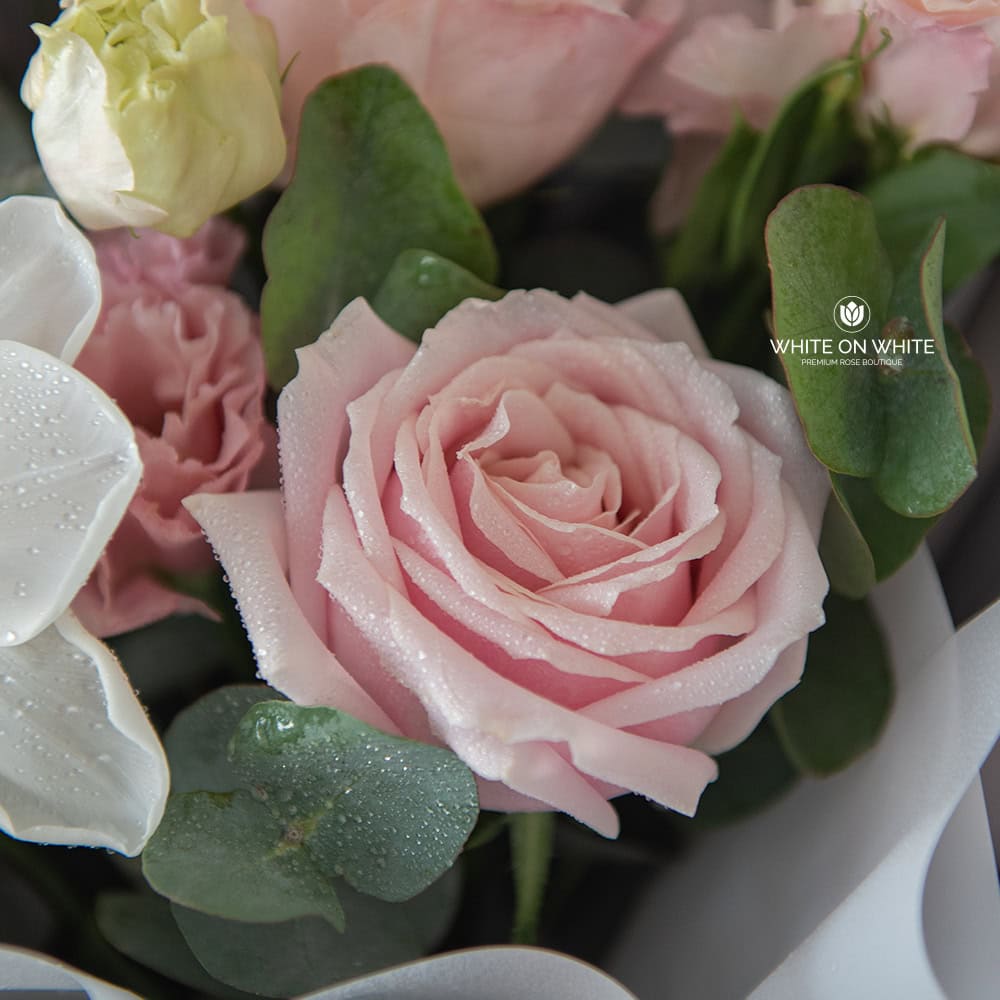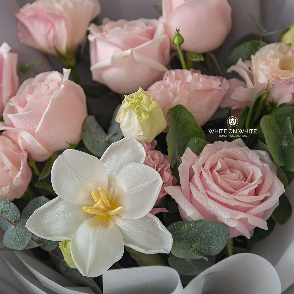 Pink Rose, Pink Eustoma, White Tulip, and Eucalyptus Leaves