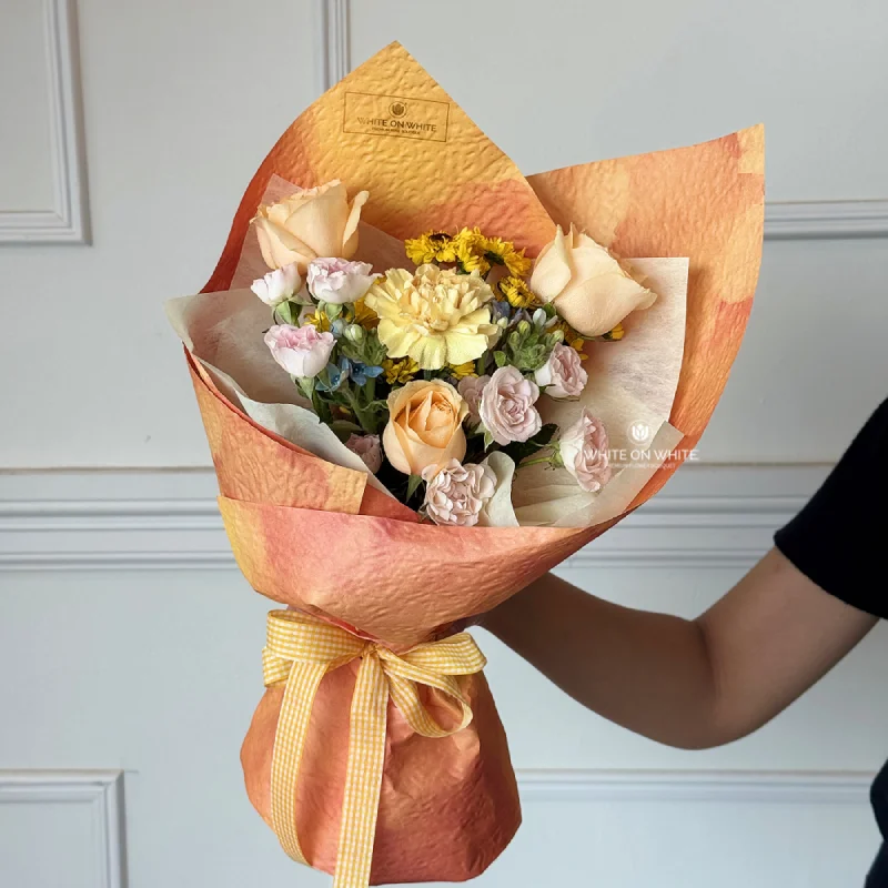 Medium: 4 stalks Champagne Rose, 2 stalks White Matthiola, 3 stalks Champange Eustoma, 2 stalks Orange Rose Spray, 3 stalks Cream Color Carnation, 2 stalks Mini Pom Pom Santini, Chamomile and Oxypetalum