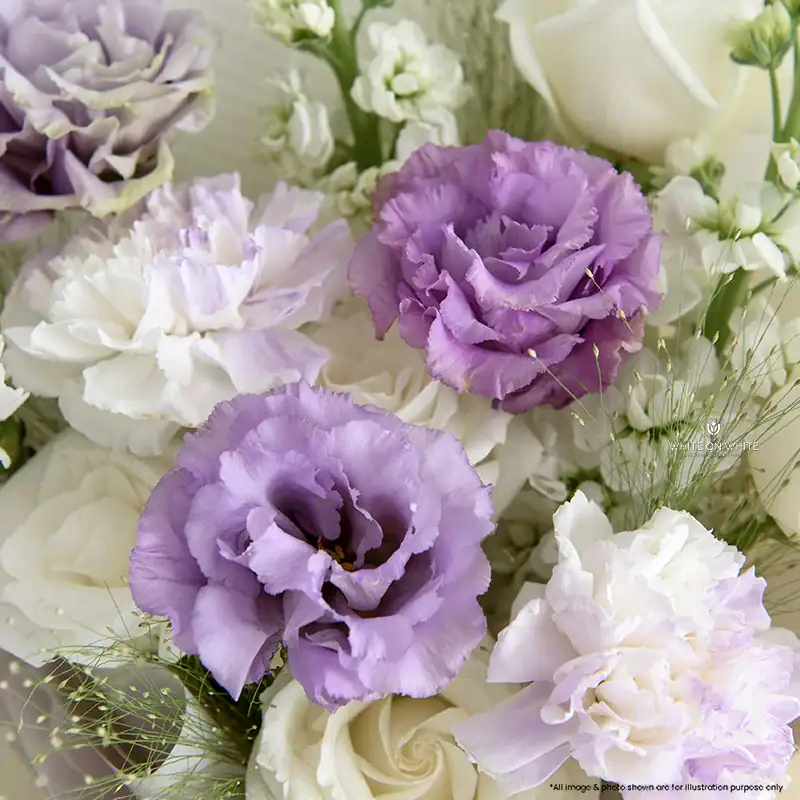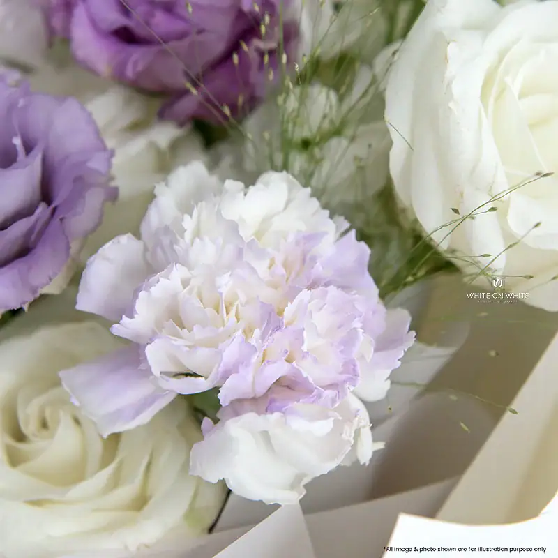 We source only the finest stems for our Valentine’s collection. For this Lilac and White Valentine Bouquet, we use a special technique to tint the carnations, ensuring the color is subtle and elegant, not harsh. We pair them with imported eustoma and roses known for their longevity and fullness. We believe a luxury gift should look extraordinary. Therefore, we ensure every petal is flawless, offering a stunning visual impact the moment it is delivered.