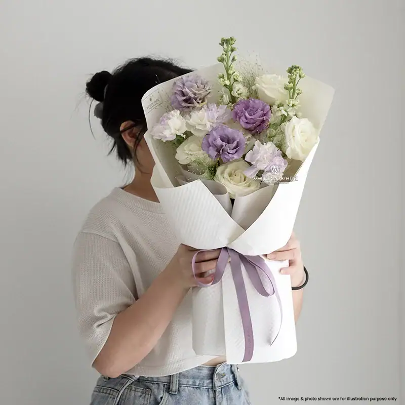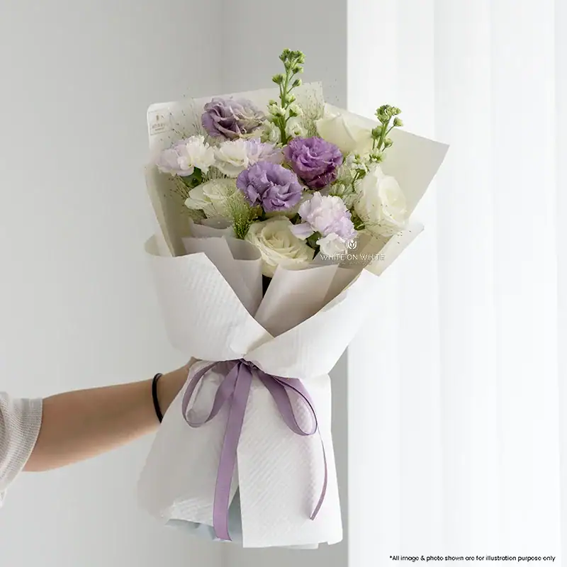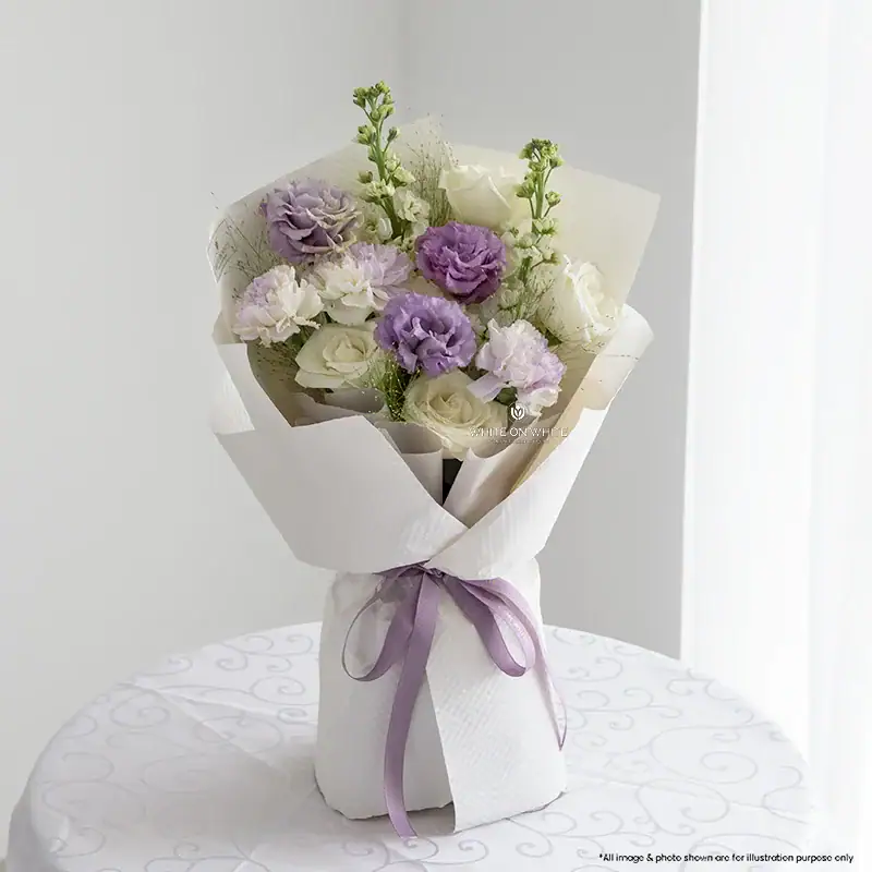 We blend the classic beauty of pristine white roses with the regal tones of purple eustoma. What makes this bouquet truly special is the inclusion of white carnations tinted in a “dreamy purple” hue, creating a watercolor effect that is rare and captivating. To add height and fragrance, we include tall white matthiola and wispy panicum grass for a gentle, swaying texture. Wrapped in premium white textured paper with a matching purple ribbon, this Lilac and White Valentine Bouquet communicates a message of enchantment and a love that is one of a kind.