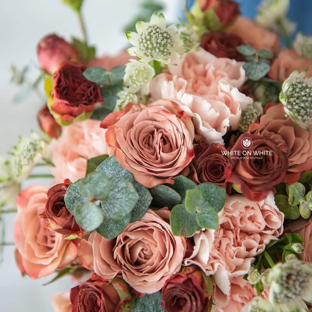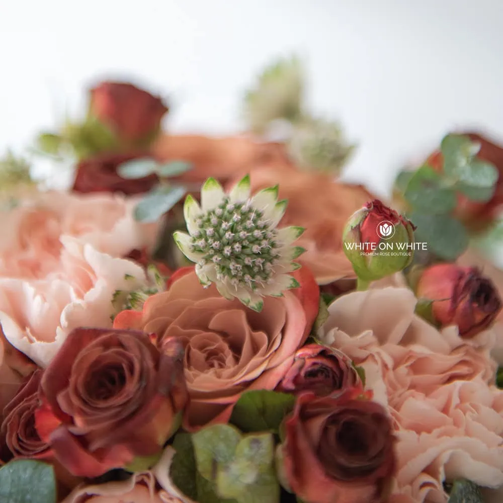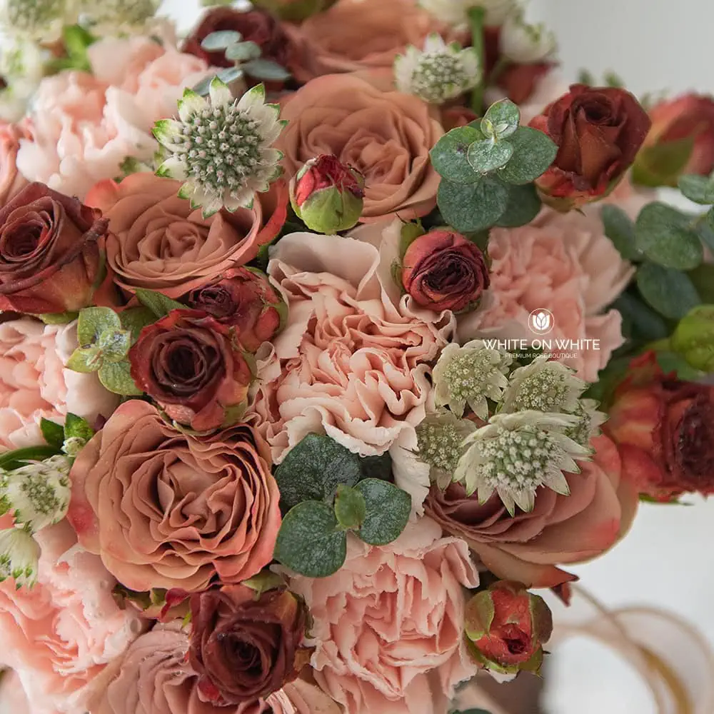 Imported Cappuccino Roses, Chocolate Bubble Spray Roses, Carnation, Astrantia and Eucalyptus