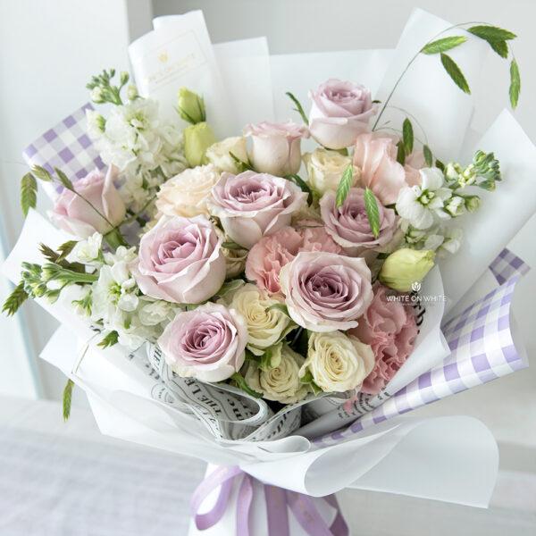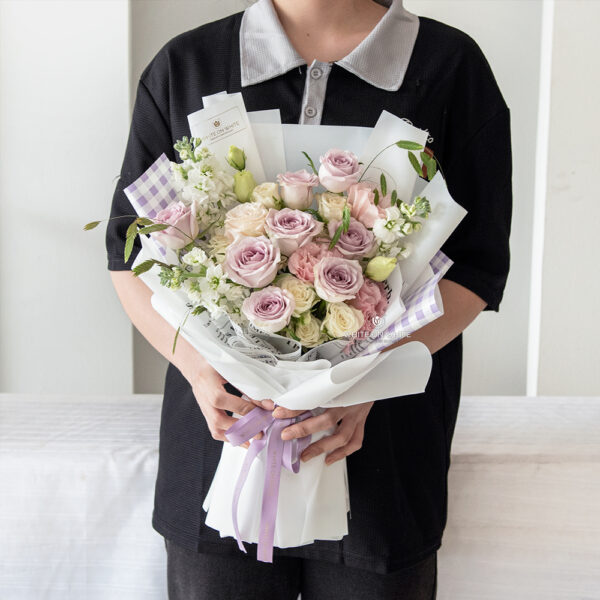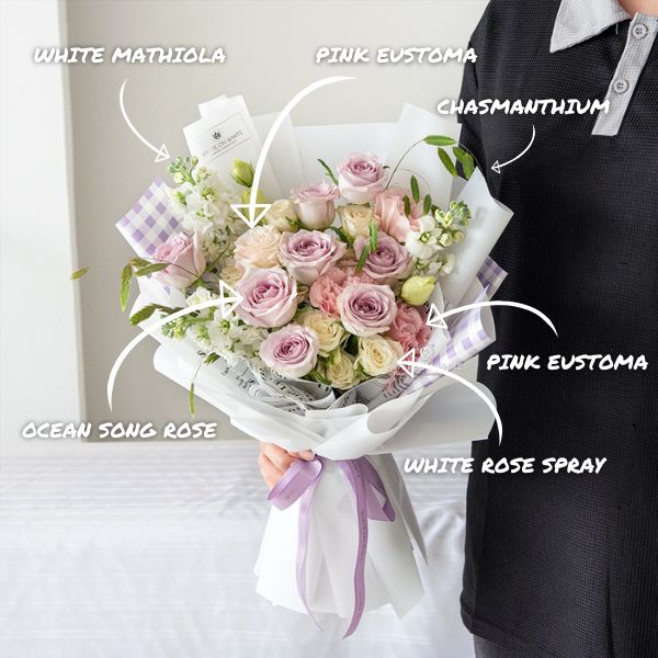 At the heart of this bouquet are 8 stalks of Ocean Song Roses, known for their enchanting lavender hue — a rare rose colour that symbolises mystery, admiration, and love that grows deeper over time. To complement this soft romance, we’ve included 1–2 stalks of Pink Eustoma, symbolising appreciation and heartfelt affection, 3 stalks of White Matthiola for sincerity and beauty, and 2–3 stalks of White Rose Spray to represent pure love. The bouquet is finished with Chasmanthium, a unique ornamental grass that adds movement, texture, and an elegant, modern twist.