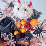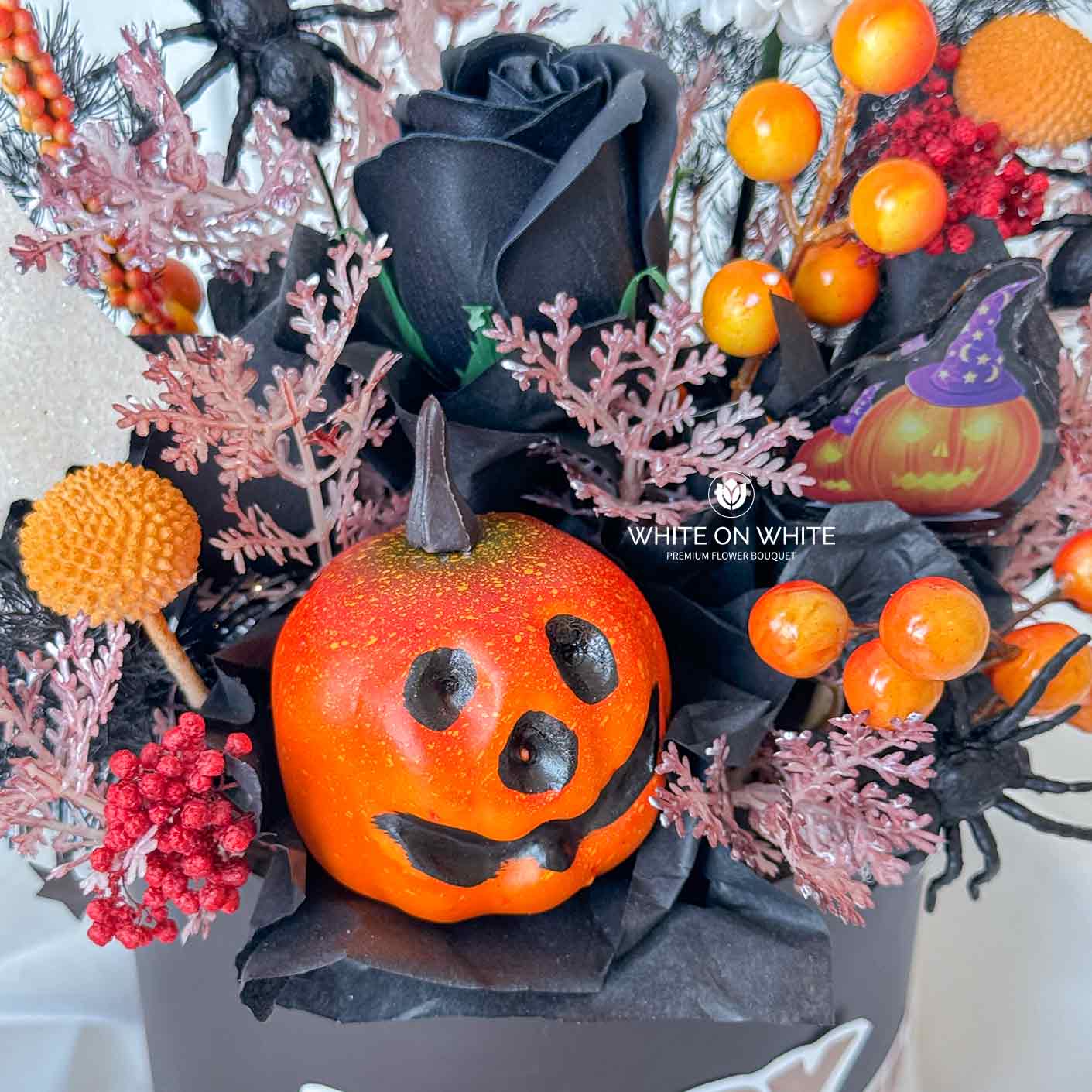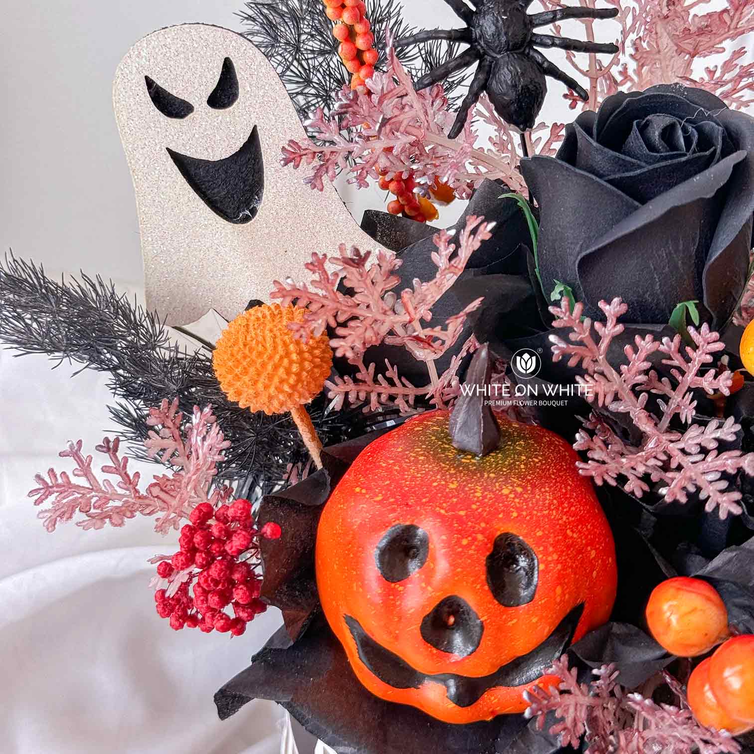 - As you explore this enchanting bouquet, you’ll discover the playful White Pingpong, cleverly designed to resemble a bat. This charming element adds a fun twist and evokes the lively spirit of Halloween nights filled with laughter and mischief.