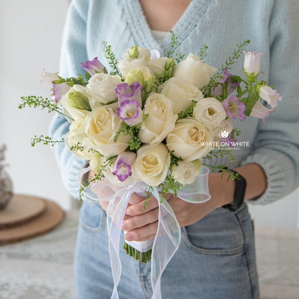 This bouquet features White Roses, Purple Campanula, White Eustoma, and Greenbell—each flower chosen for its symbolism and meaning on your special day.