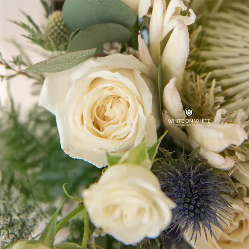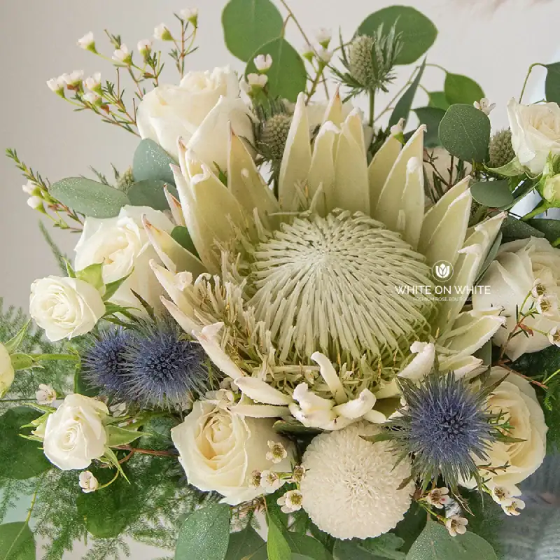 White Protea King, Eryngium, White Rose, White Rose Spray, Ping Pong Chrysanthemum, Wax, and Fillers