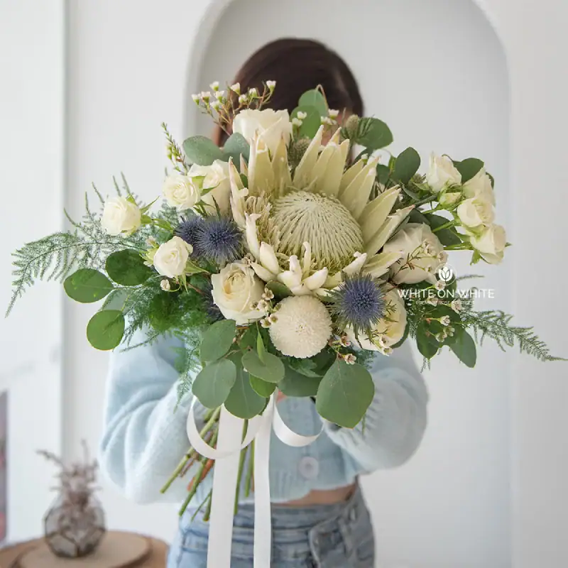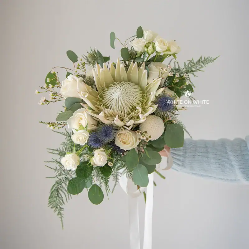 - The White Protea King at the center of this bouquet is a bold and captivating flower, representing strength, resilience, and transformation—perfectly embodying the journey you and your partner are beginning together.
