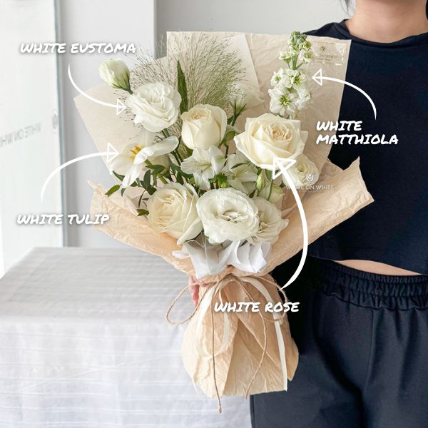 White Tulip, 3 stalks of White Rose, 1 stalk of White Matthiola 1-2 stalks of White Eustoma, 1 stalk of Alstoemeria, and Green Bell