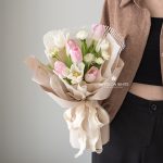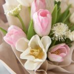 Pink Tulip, White Tulip, White Carnation Spray, and Trachymene
