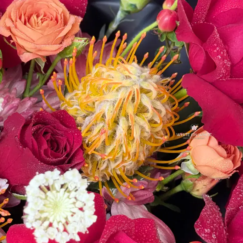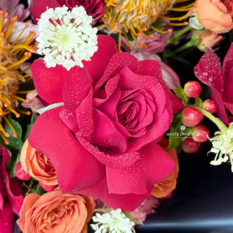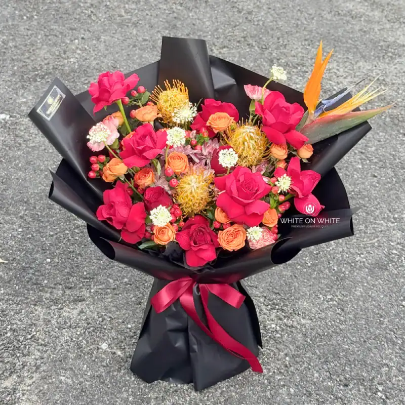 This bouquet features a rich and warm palette of deep red, fiery orange, soft white, and vivid berry tones—carefully balanced to create a refined yet dramatic aesthetic. The interplay of these colours evokes luxury, confidence, and passion, making it ideal for someone truly special.