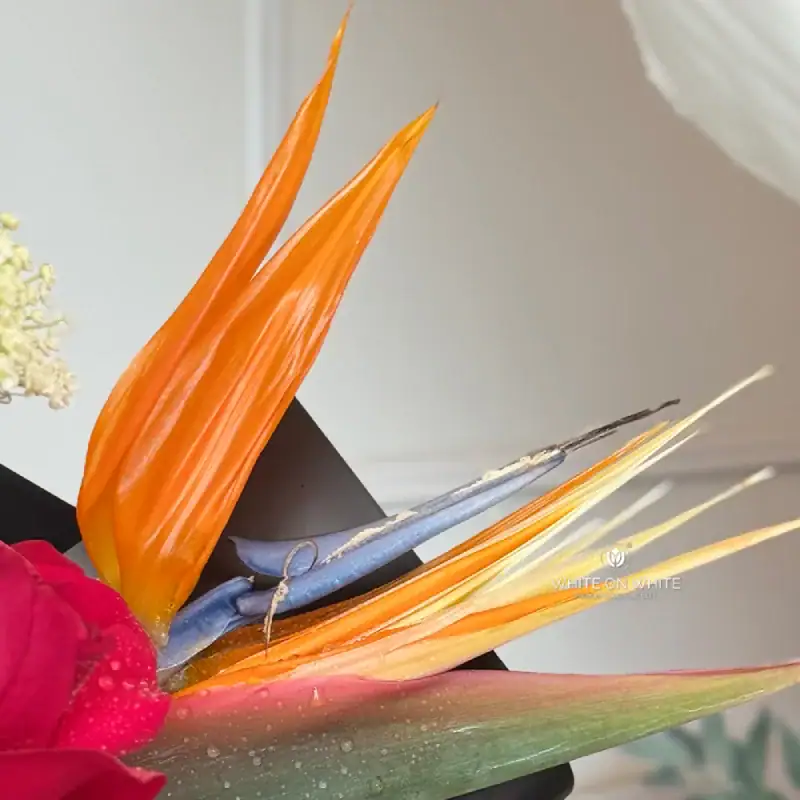 - 1 stalk of Bird of Paradise — symbolising joy, paradise, and freedom, this tropical beauty brings a sense of grandeur and sophistication.