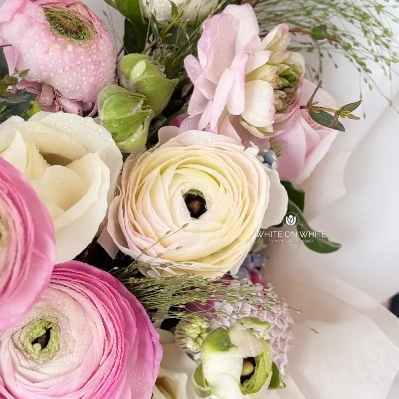 Inside this bouquet, you’ll find charming Pink Ranunculus, romantic Pink Roses, and White Roses. We’ve added delicate Trachymene, Panicum, starry Oxypetalum, and Parvifolia leaves to complete the sweet, balanced look. Together, these blooms create a soft and beautiful pastel bouquet that’s full of life and meaning.