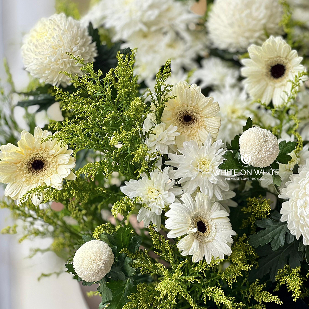 White Daisy Gerbera, White Chrysanthemum, White Ping Pong, White Anastasia and Filler