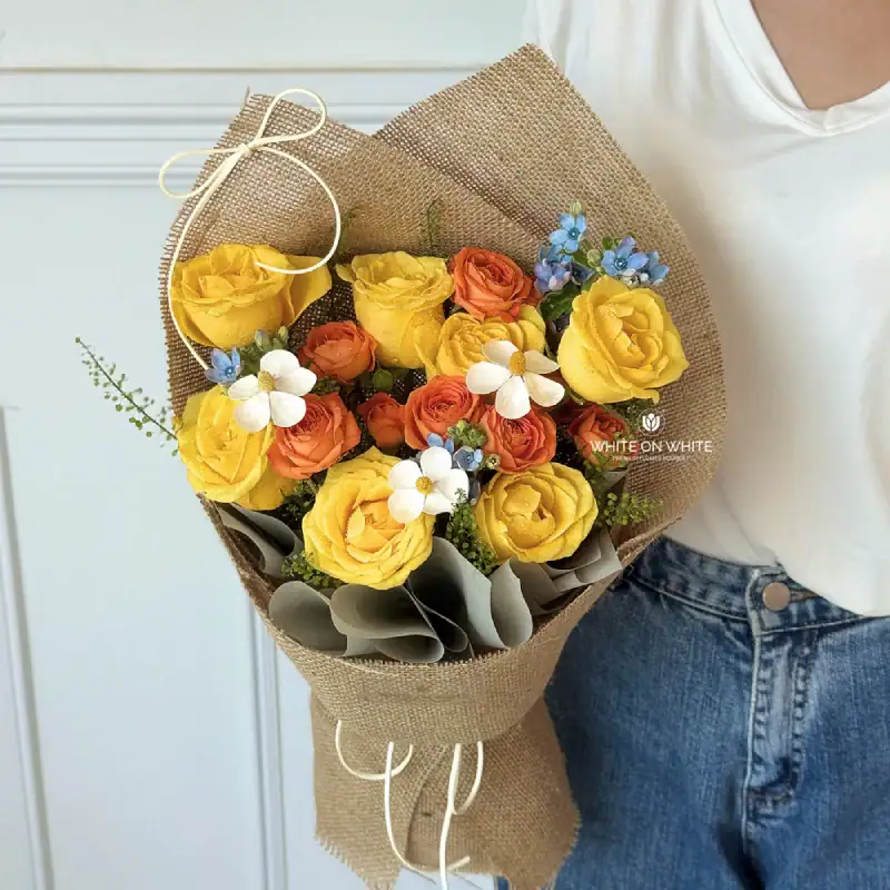 Expect a cheerful blend of yellow, orange, violet, and soft blue, wrapped in natural brown tones. Whether you’re browsing for a KL florist or searching for an Ipoh flower shop with unique designs, this bouquet is your answer — bright, breezy, and full of character.