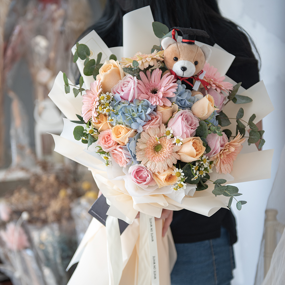 - Hydrangea, with its abundant petals, signifies the gratitude and admiration for the graduate’s determination. It reflects of the many challenges overcome and the growth during the academic journey.