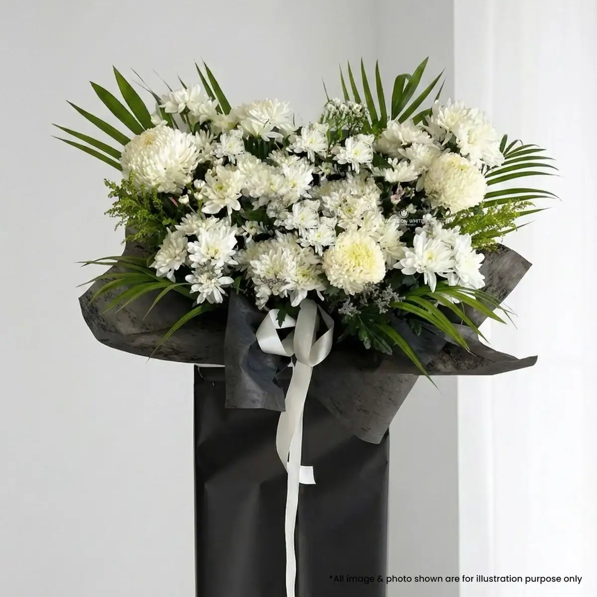 A master florist with over 20 years of industry experience guides our floral team. Under this expert leadership, all 15 of our florists train twice a week to refine their skills. Furthermore, they constantly perfect their techniques to ensure structural integrity and visual balance. This continuous training ensures that every White Chrysanthemums Condolence Stand we create meets the premium quality and artistry that White On White is known for.