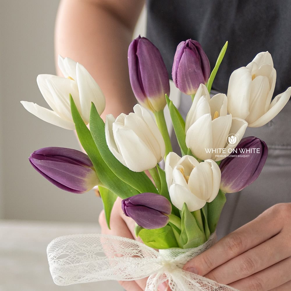 The Purple Tulip Bridal Bouquet radiates elegance and charm, making it the perfect complement to a bride’s white dress. This stunning arrangement features vibrant purple tulips nestled among delicate white tulips, creating a striking contrast that symbolizes both love and purity.