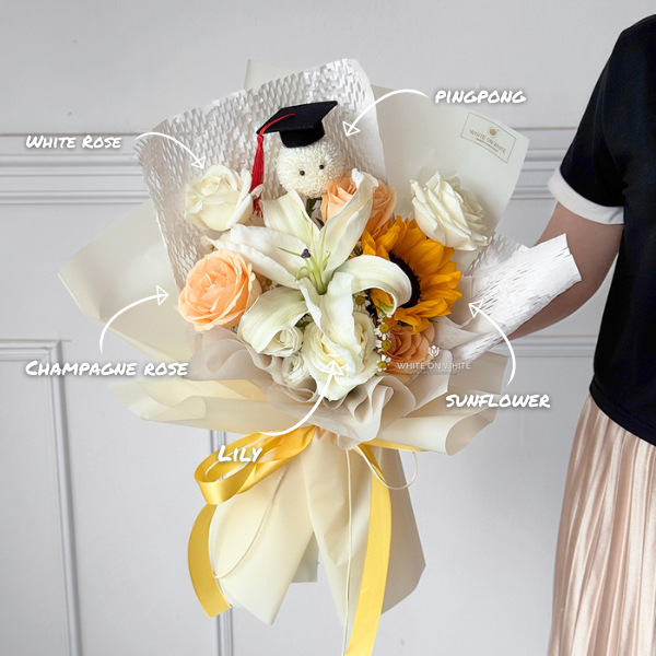 We pay close attention to every single stem. Even the slightest brown petal is carefully removed to ensure that your graduation flower bouquet arrives in flawless condition. This dedication to detail is why White On White is trusted as the go-to florist in Penang, florist Petaling Jaya, and beyond.