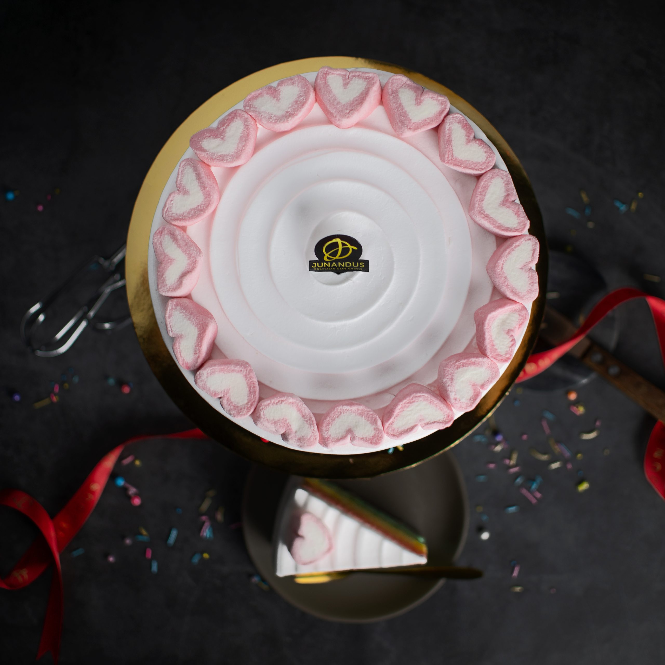 - But that’s not all—our cake is topped with charming heart-shaped marshmallows that add a playful touch, making it an even sweeter treat. Adorned with colorful sprinkles on the sides, this cake is not just a dessert; it’s a show-stopping centerpiece that sets the tone for any celebration.