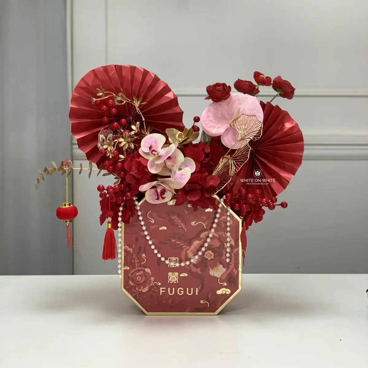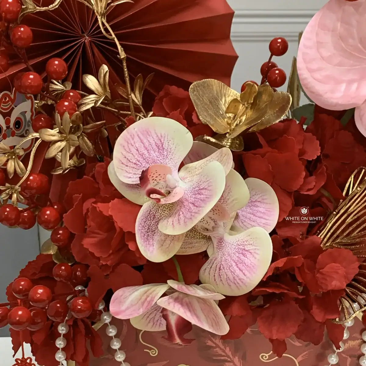 Designed in vibrant red, this exquisite arrangement captures the essence of prosperity, making it the perfect addition to your Chinese New Year floral decor. Red, a color symbolizing good fortune and success, fills your space with positive energy and festive cheer.
