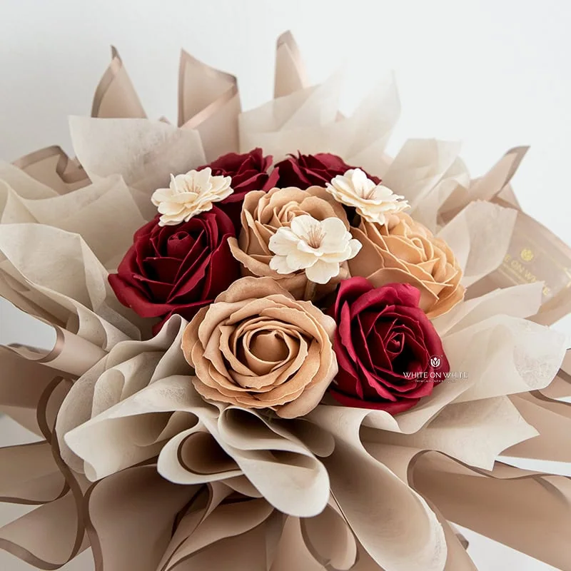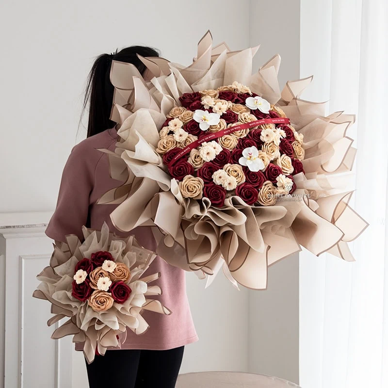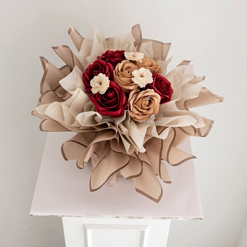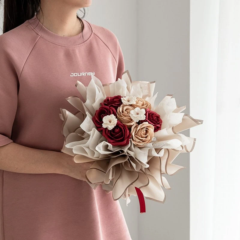 Our arrangements are made using premium imported soap and artificial flowers, crafted with realistic textures and rich colours. Each bloom is designed to mimic the look of fresh petals, giving your bouquet an elegant, high-quality finish from every angle.