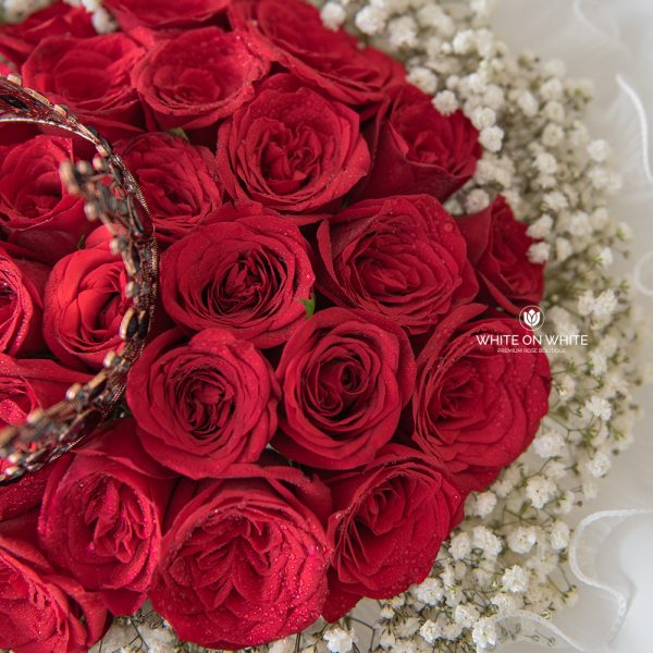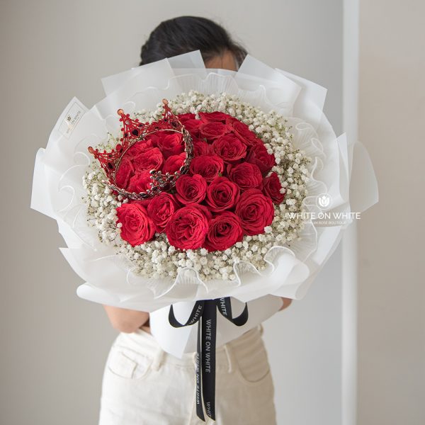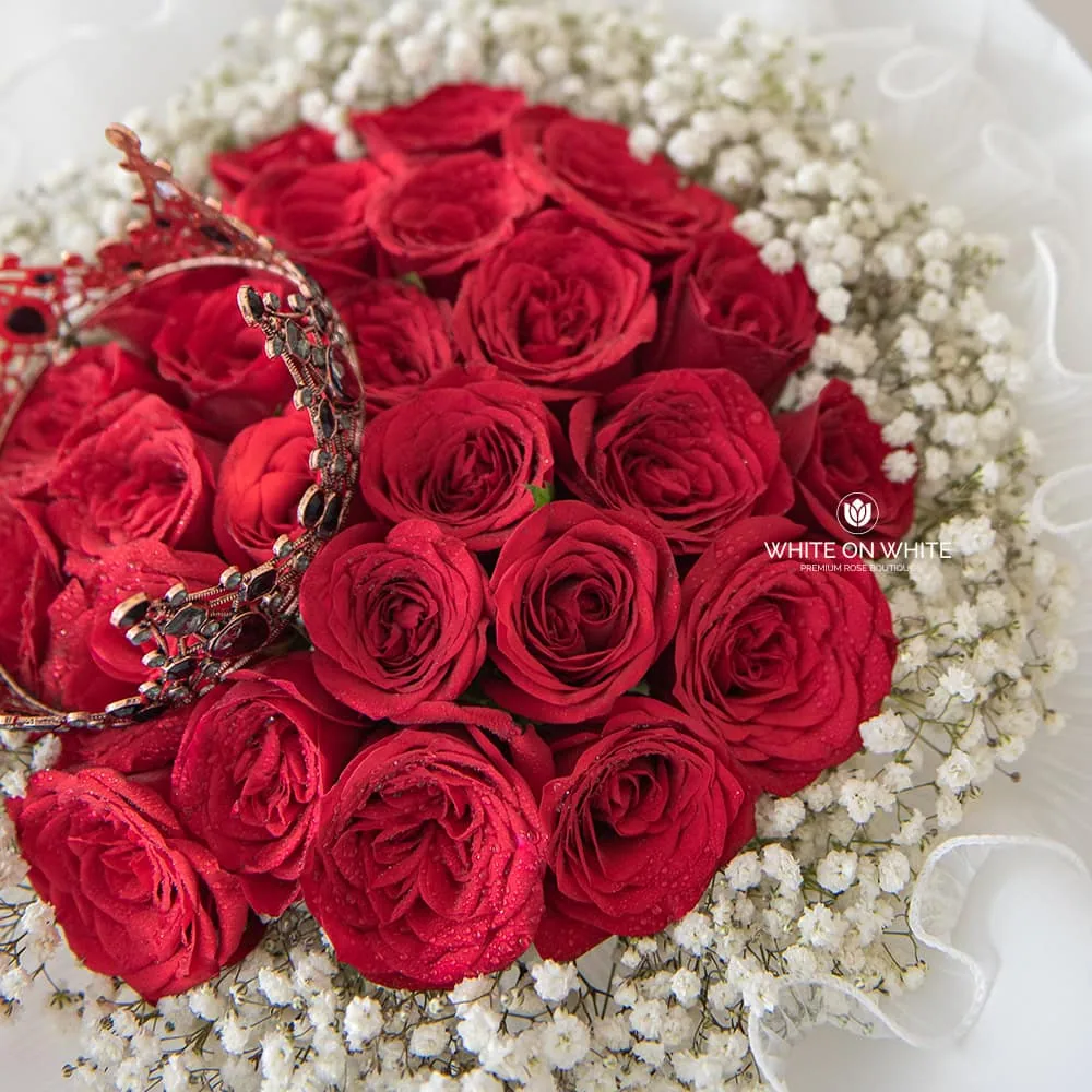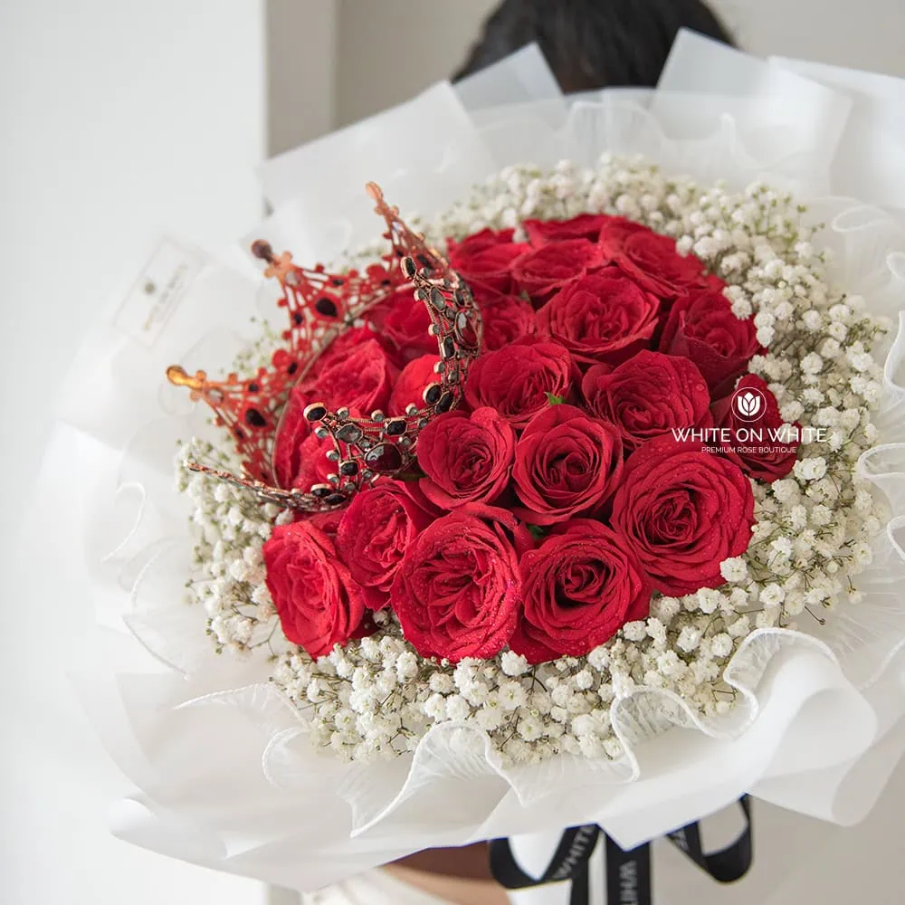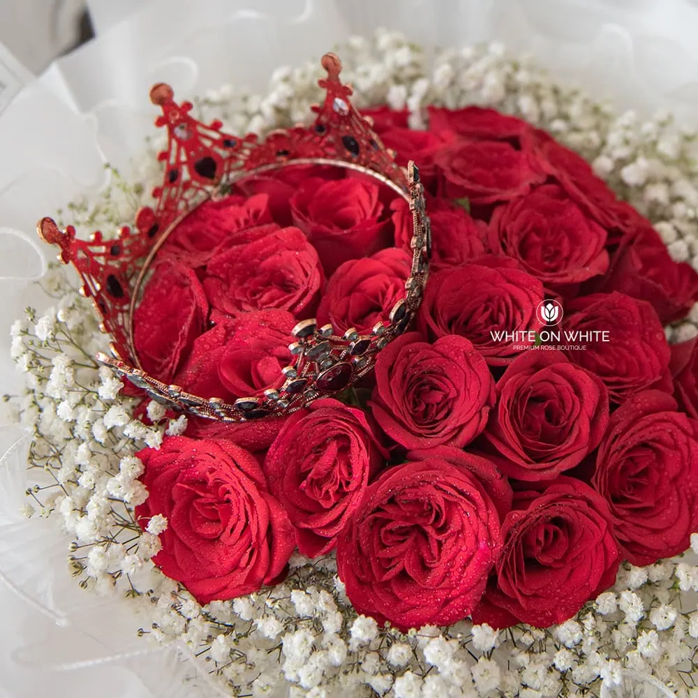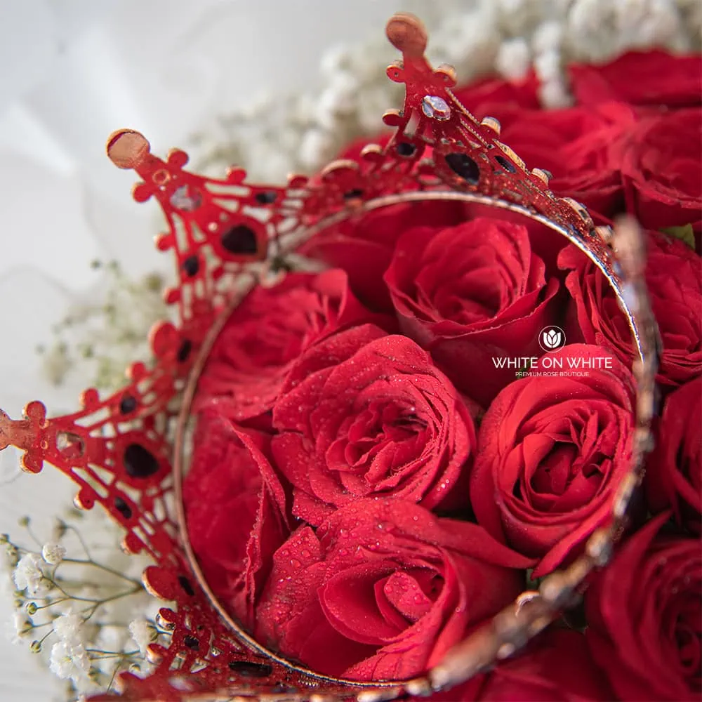 - The addition of the crown signifies how much she means to you, making her feel like the queen she truly is on her special day. Every detail, from the rich red petals to the delicate baby’s breath, speaks volumes about your feelings.