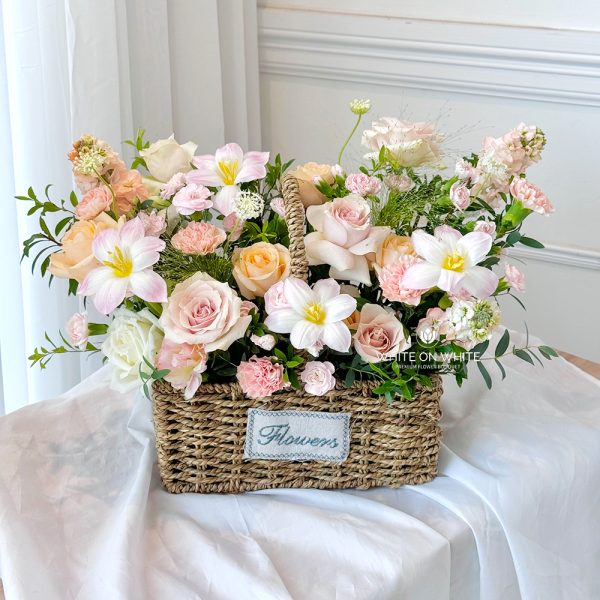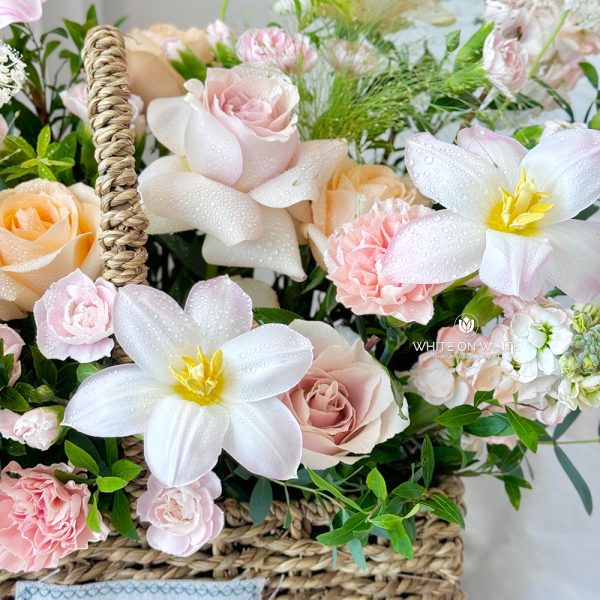 Inside this handcrafted basket, you’ll find a carefully selected mix of fresh and elegant blooms. It includes:
