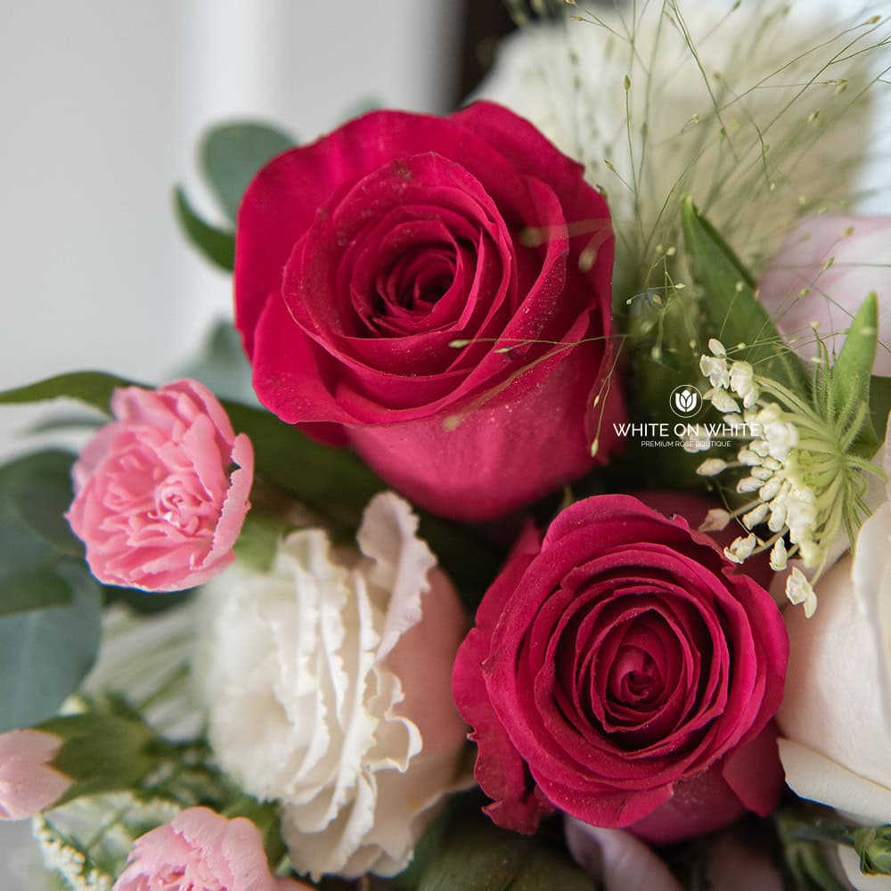 • At the heart of the bouquet, the Dark Pink Rose symbolizes admiration, gratitude, and the deep respect you have for your soulmate. Also, this rose speaks to the strength of your love, the way it has grown deeper and more meaningful over time. Thus, it’s a reminder of every moment, every sacrifice, and every shared memory that has brought you to this day.
