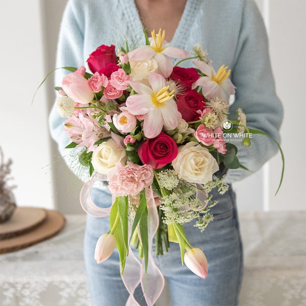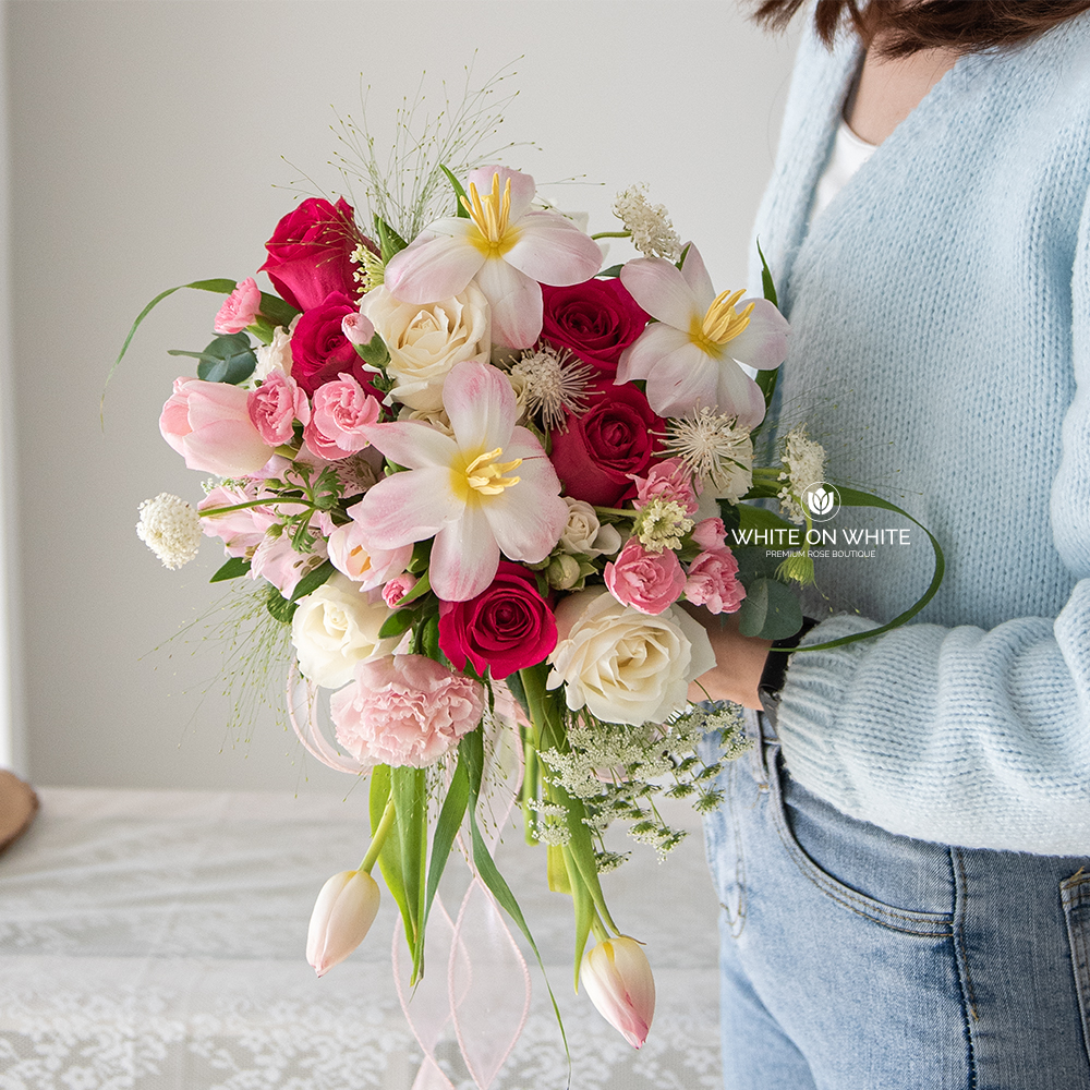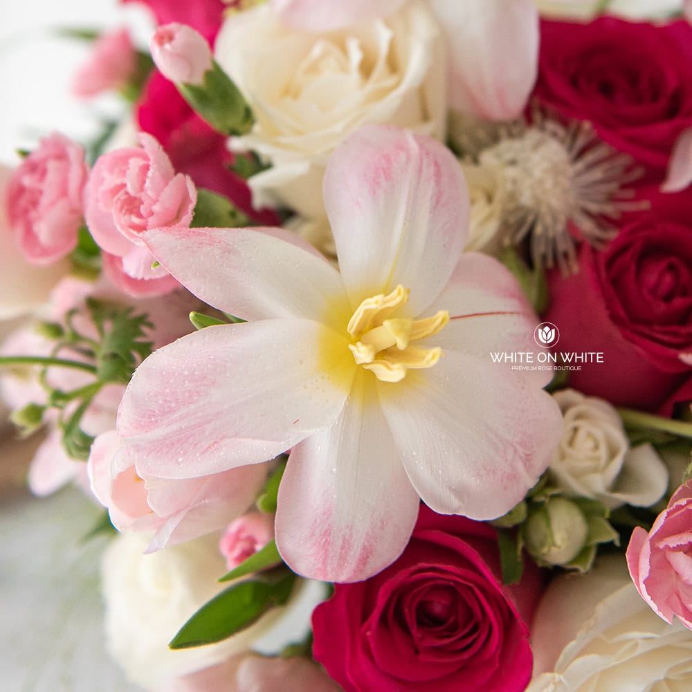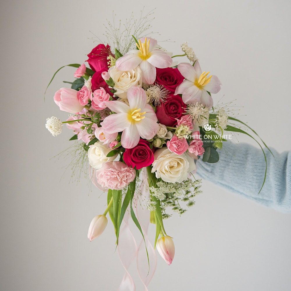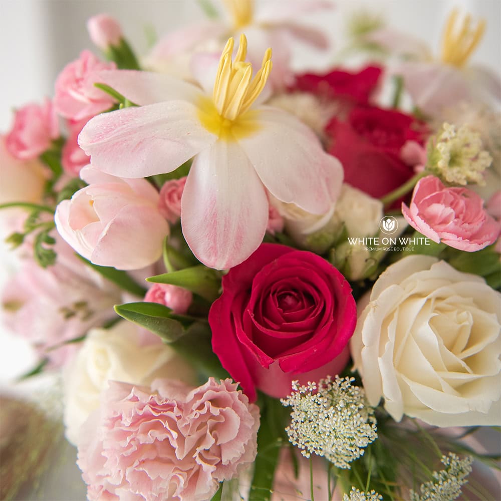 Dark Pink Rose, White Rose, Pink Tulip, Pink Carnation Spray, Pink Eustoma, Pink Alstroemeria, White Rose Sprat, Thrachymene, Ammi Majus, and Panicum