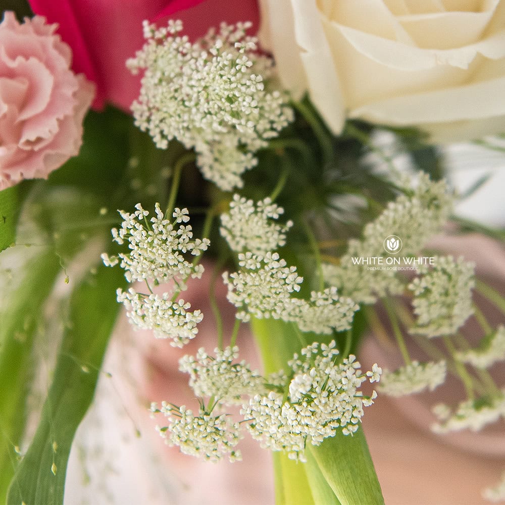 • The delicate touches of Thrachymene, Ammi Majus, and Panicum add softness and lightness to the bouquet.