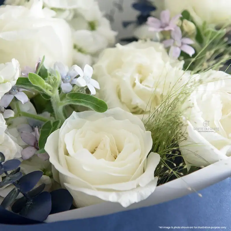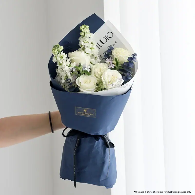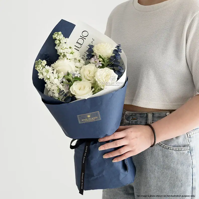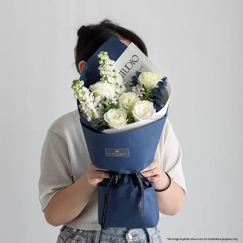 We curate a stunning mix of premium white roses, tall white matthiola, and delicate eustoma to create a texture of pure luxury. To add a unique touch, we accent the pristine white blooms with “Blue Star” Oxypetalum, adding a rare pop of color. Finally, we wrap the arrangement in deep navy blue paper, which creates a striking contrast against the bright flowers. This combination creates a bold yet romantic visual. Whether for a husband, wife, or partner, this White Rose Valentine Bouquet communicates a message of steady, unwavering love.