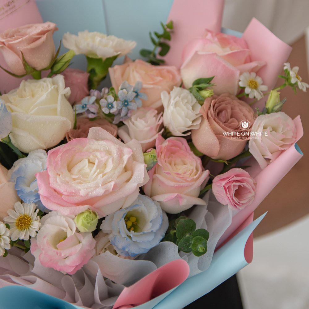 - Alongside it, the Eustoma and White Carnations add elegance and grace, symbolizing the respect and admiration you hold for your partner. These flowers capture the beauty of a relationship built on trust, loyalty, and mutual respect.