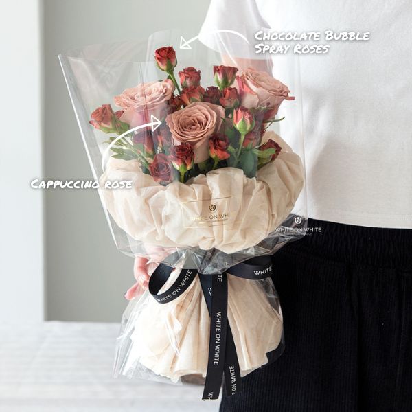 The Sweet Baby Bouquet features a rich, modern palette of warm cappuccino beige and mocha brown tones, brought to life through the pairing of Cappuccino Roses and Chocolate Bubble Spray Roses. These earthy, romantic hues blend seamlessly to create a bouquet that feels both understated and luxurious.